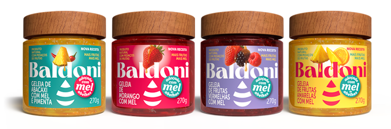 Tudo o que nos surpreende na vida tem sabor. E isto você encontra de sobra em cada pote das geleias e doces da Baldoni: o frescor das frutas em pedaços, delicadamente adoçadas com mel. São 5 sabores diferentes que te levam à uma nova experiência. Elas serão protagonistas na cozinha para despertar a sua criatividade, para acompanhar o seu café ou simplesmente, comer de colher. ADOCE A VIDA COM BALDONI.